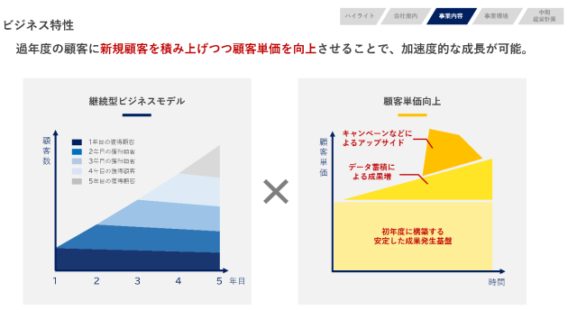 データが蓄積することで成果発生数が大きくなりやすいため、顧客あたり売上は上がる。