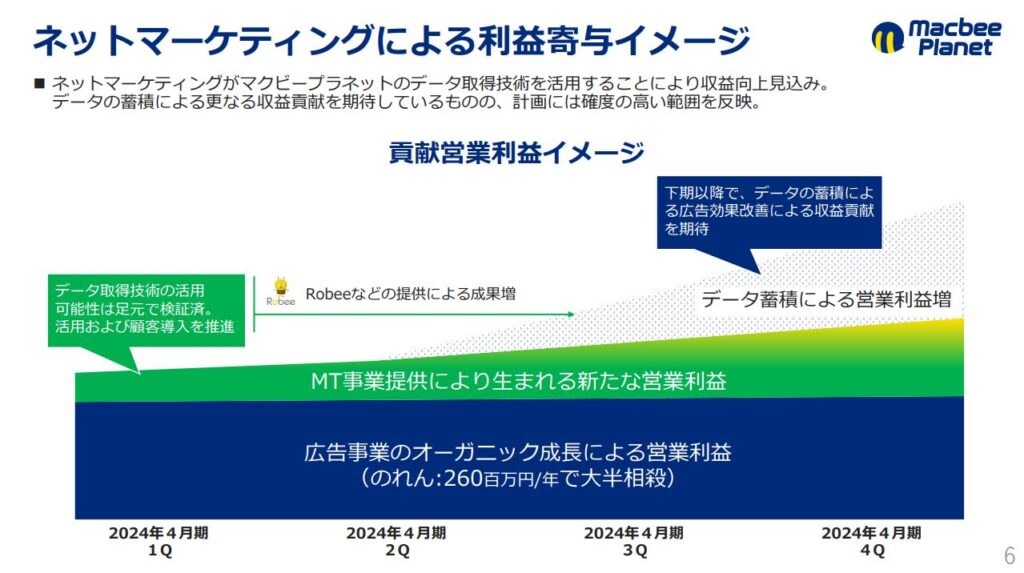 上半期はこれらに取り掛かる想定で、恐らく下期位からネットマーケティングの広告事業も伸びてくるのではないかと思うが、じゃあMacbee Planetと同様の粗利率20%営利率10%という水準をいつ達成できるかという点について、正確な時間軸がイメージしている訳ではない。