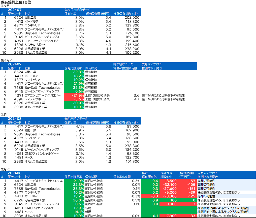 コアコンセプト・テクノロジー、システムサポート、GMOフィナンシャルゲート、ベースについて、組入上位銘柄の変動がありました。