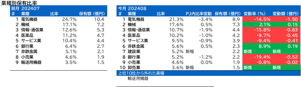 業種別保有比率に変動がありました。
