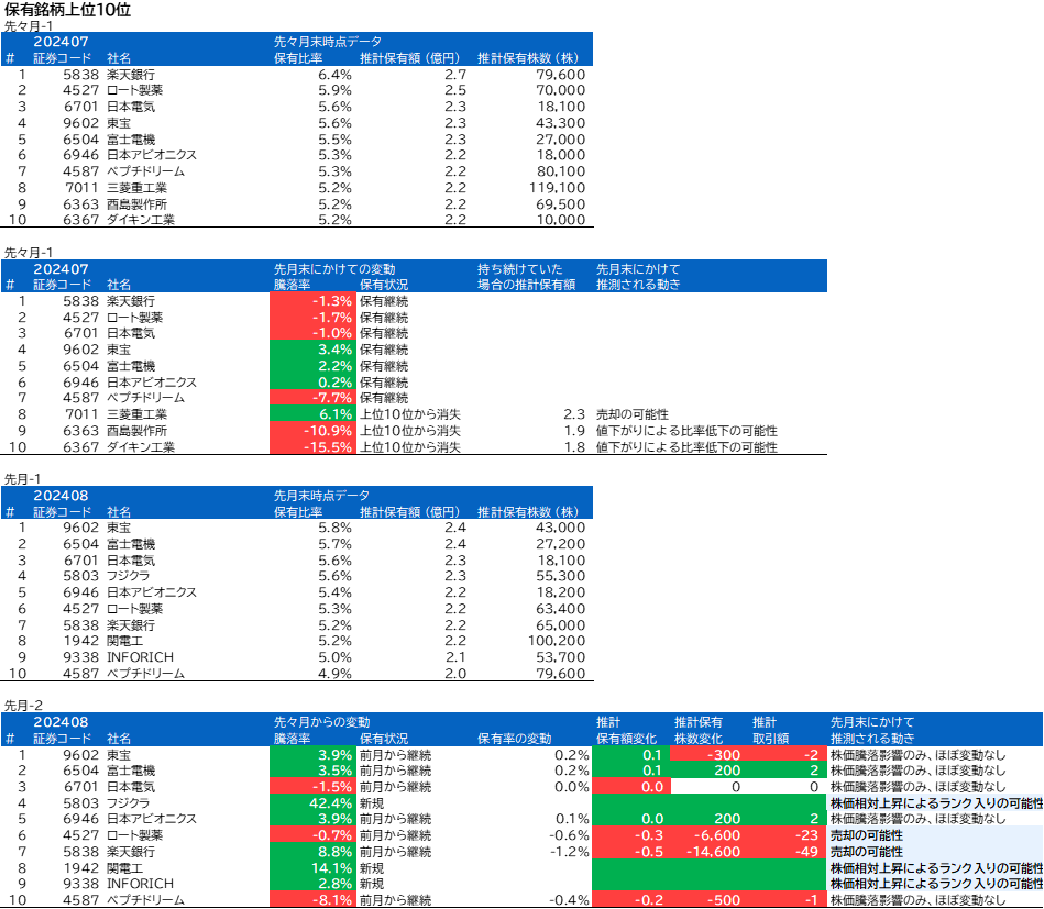 7月の保有9位の酉島製作所は、8月の保有上位10銘柄には入っていませんでした。値下がりにより相対的に株価が下落した結果だと思われます。