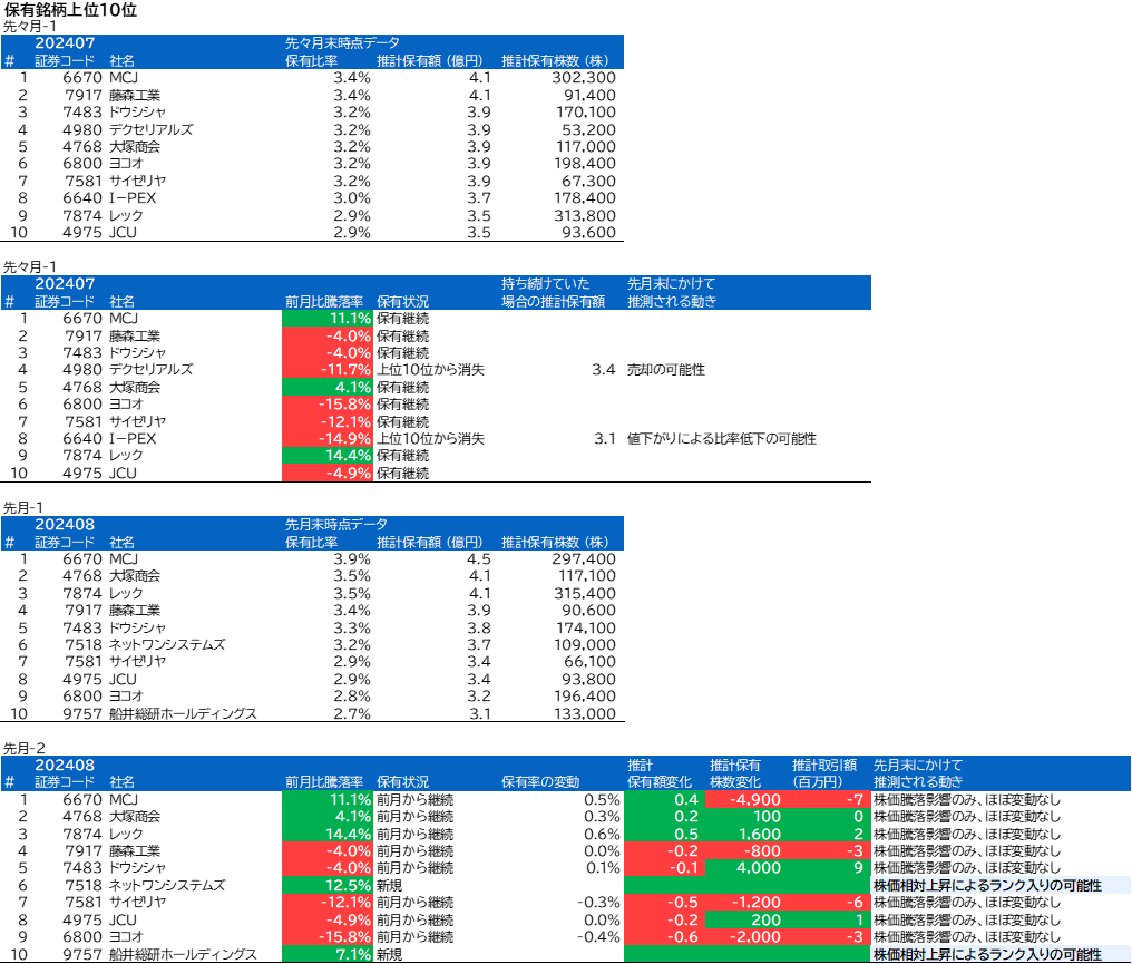 デクセリアルズ、I-PEX、ネットワンシステムズ、船井総研ホールディングスについて、組入上位銘柄の変動がありました。