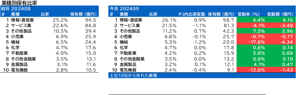 情報·通信業の保有比率はPF内1位で変わりませんでしたが業種指数の変動以上に大きく上昇しました。
