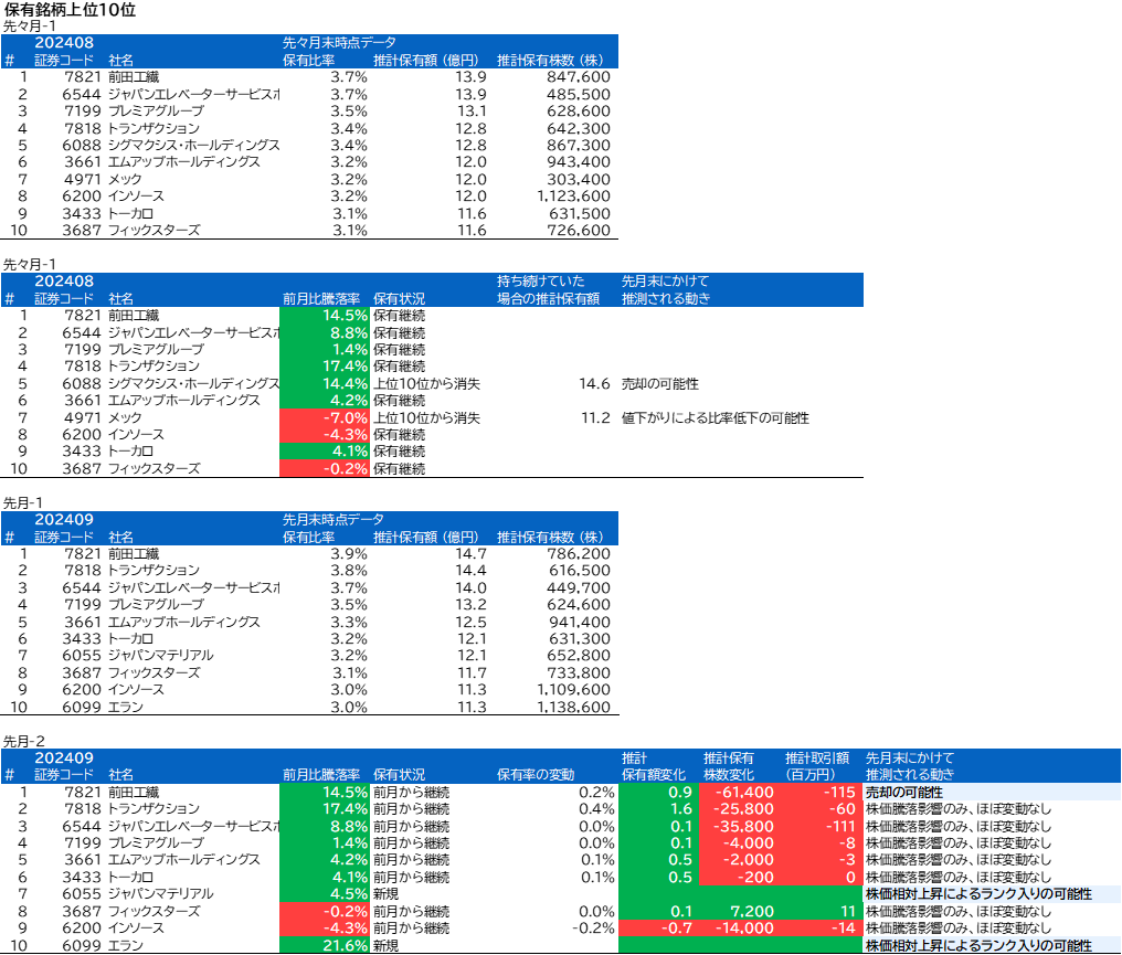 先月の保有内1位の前田工繊は今月も1位でしたが、騰落率と保有額からの推計によると売却があったと思われます。