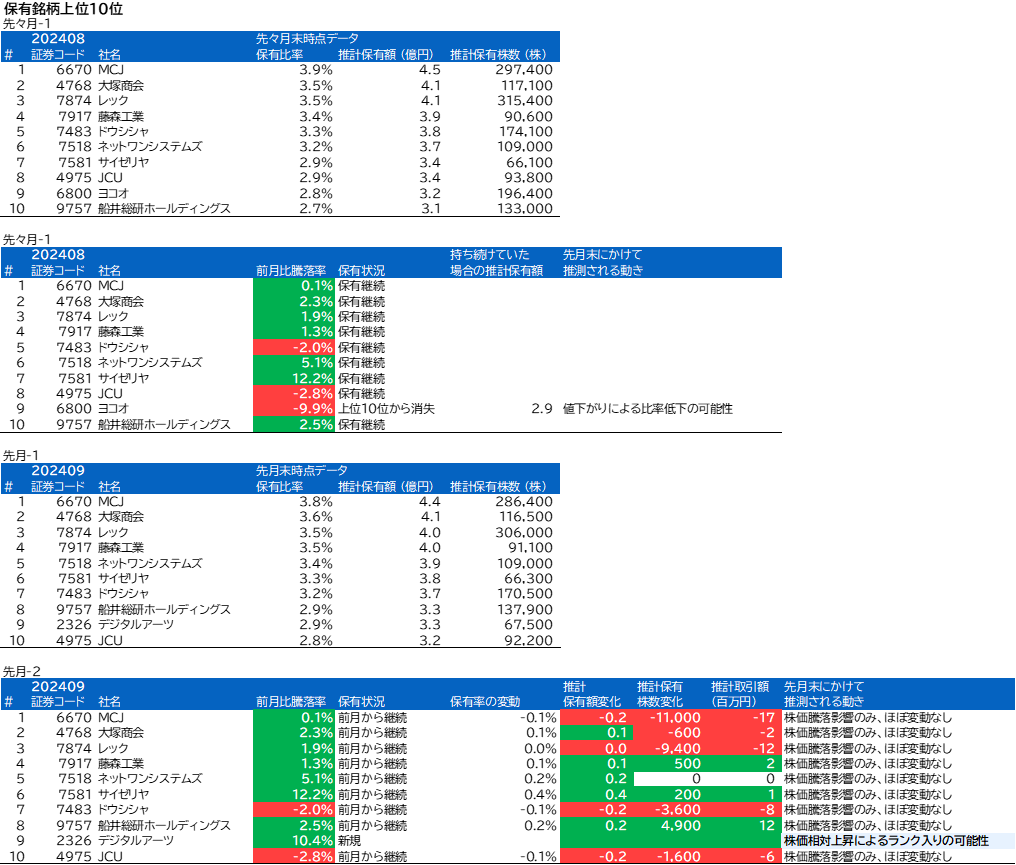先月の保有9位のヨコオは、今月の保有上位10銘柄には入っていませんでした。値下がりにより相対的に株価が下落した結果だと思われます。