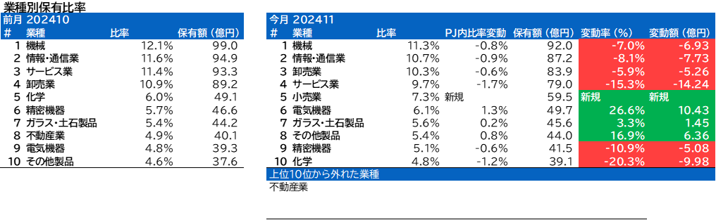 業種別保有比率に変動がありました。