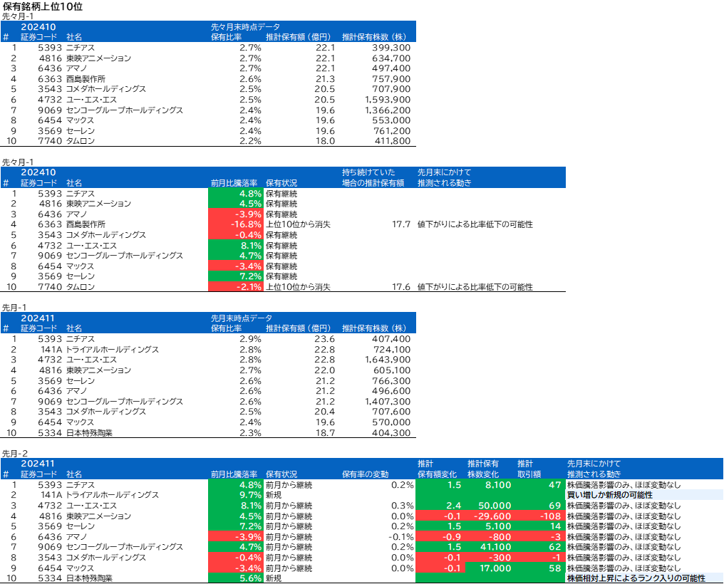 酉島製作所、タムロン、トライアルホールディングス、日本特殊陶業について、組入上位銘柄の変動がありました。