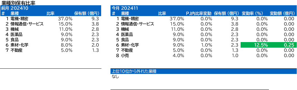 業種別保有比率に変動がありました。