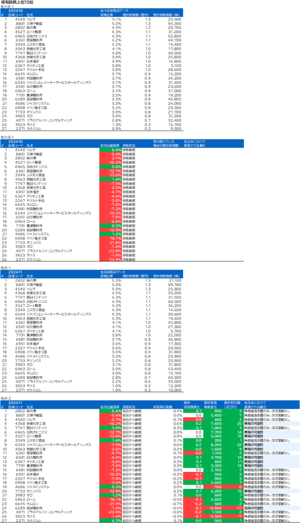 先月の保有8位の信越化学工業は今月10位となりました。買い増しが行われたと思われます。