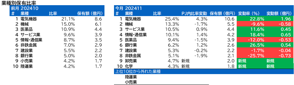 電気機器の保有比率はPF内1位で変わりませんでしたが業種指数の変動以上に大きく上昇しました。