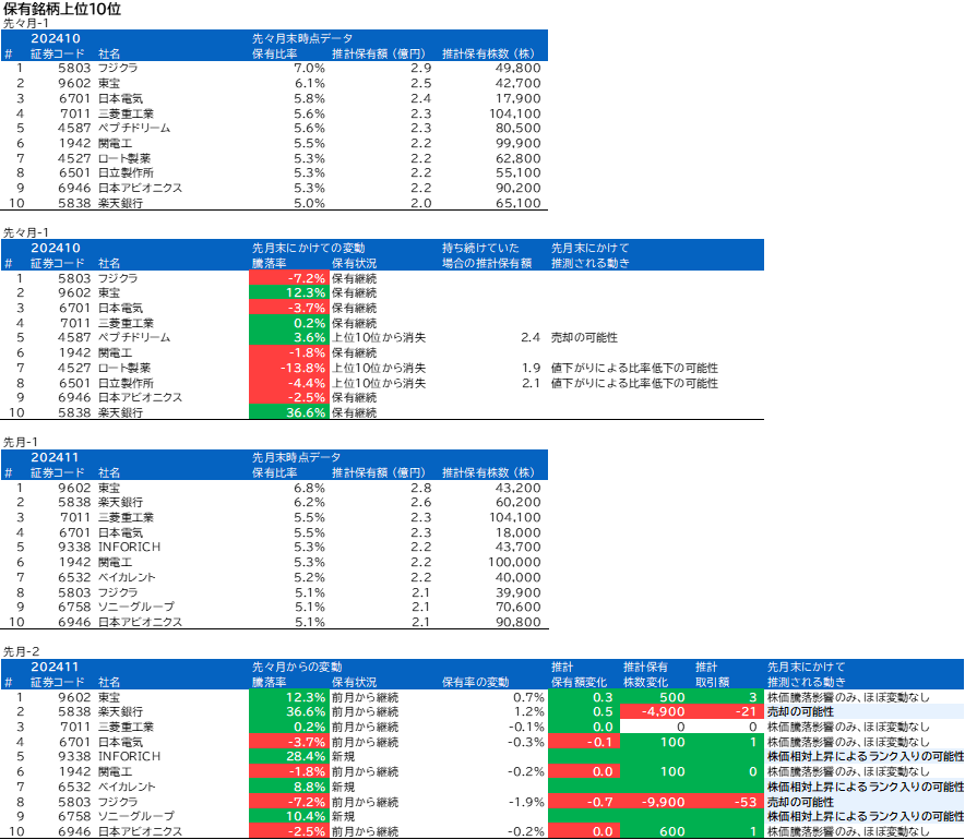 先月の保有内1位のフジクラは今月は8位でした。騰落率と保有額からの推計によると売却があったと思われます。