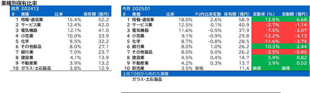 情報·通信業の保有比率はPF内1位で変わりませんでしたが業種指数の変動以上に大きく上昇しました。