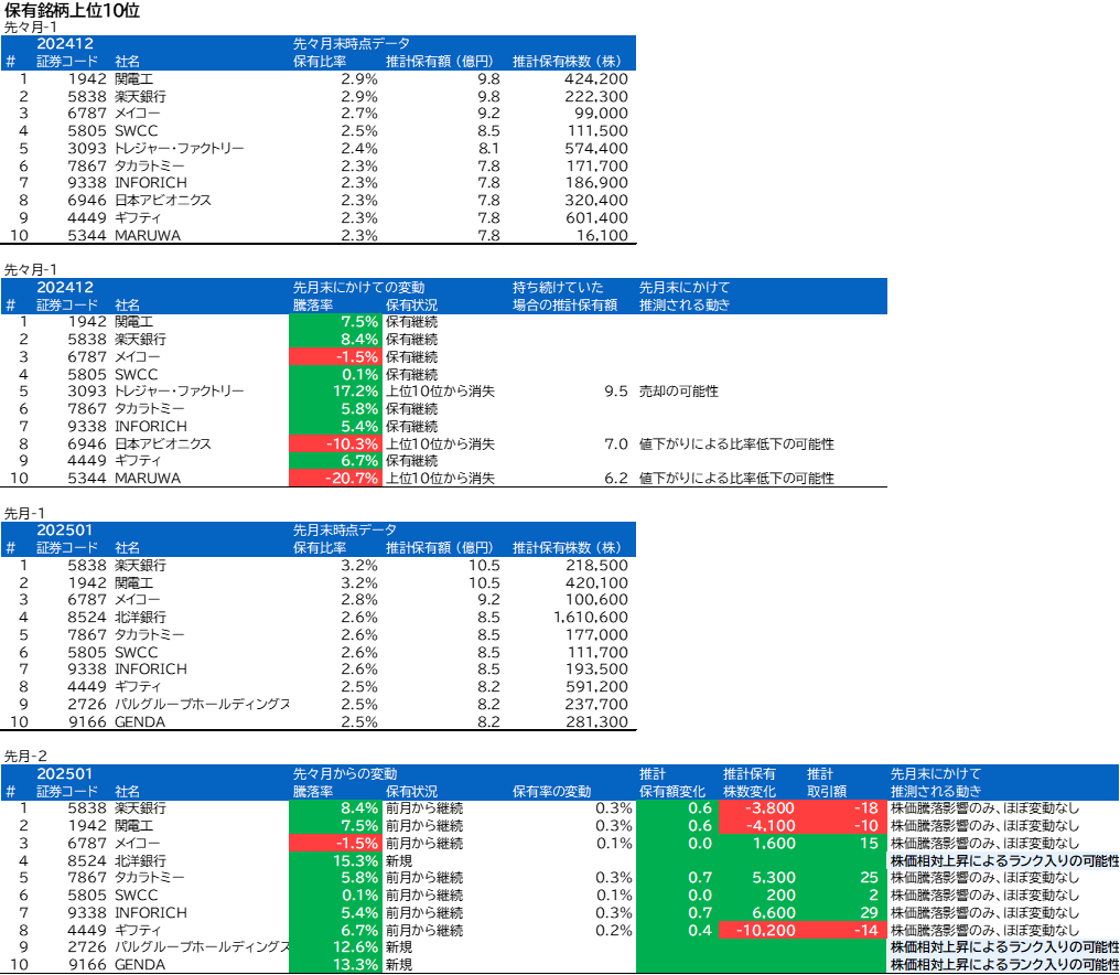 先月の保有10位のMARUWAは、今月の保有上位10銘柄には入っていませんでした。値下がりにより相対的に株価が下落した結果だと思われます。