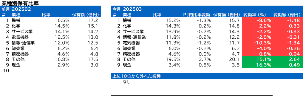 機械の保有比率はPF内1位で変わりませんでしたが業種指数の変動以上に大きく下落しました。