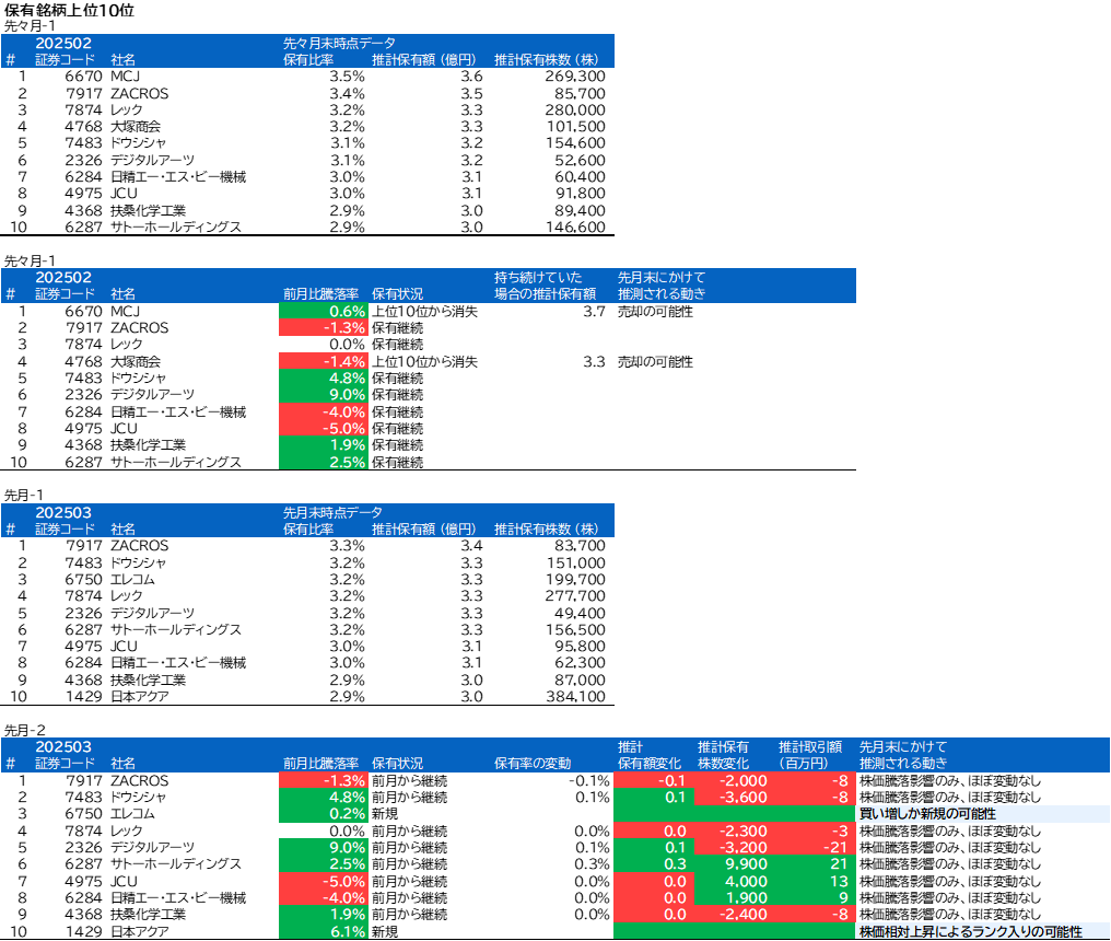 MCJ、大塚商会、エレコム、日本アクアについて、組入上位銘柄の変動がありました。