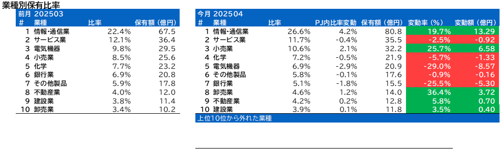 建設業の保有比率がPF内9位からPF内10位に下がりました。