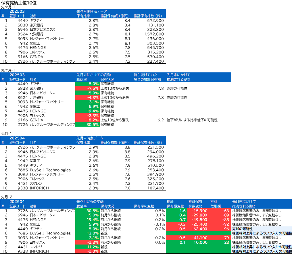 楽天銀行、北洋銀行、GENDA、BuySell Technologies、スマレジ、INFORICHについて、組入上位銘柄の変動がありました。