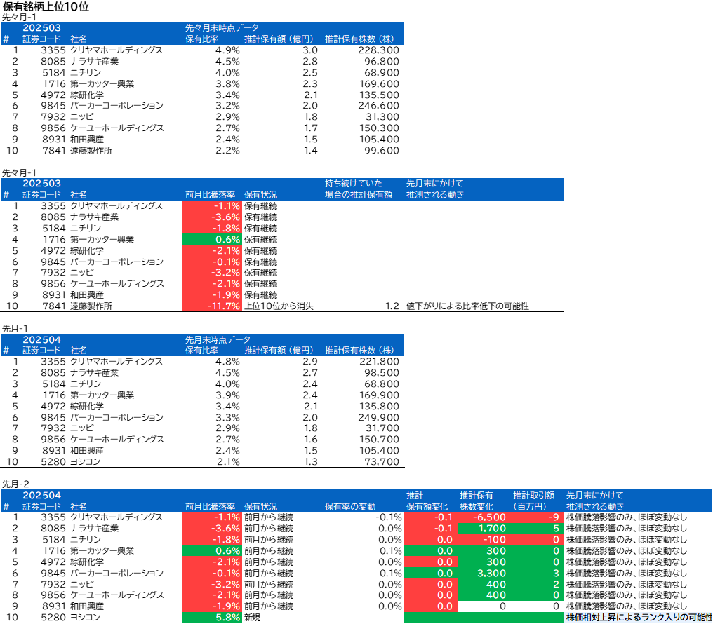 遠藤製作所、ヨシコンについて、組入上位銘柄の変動がありました。