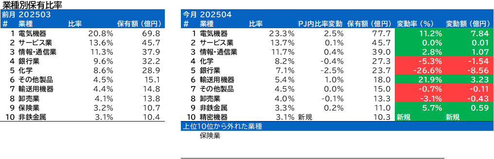 電気機器の保有比率はPF内1位で変わりませんでしたが業種指数の変動以上に大きく上昇しました。
