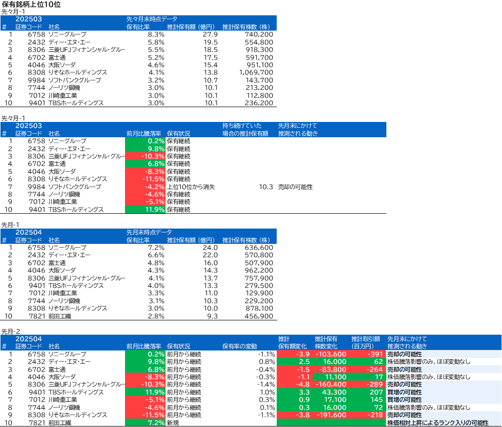 先月の保有内1位のソニーグループは今月も1位でしたが、騰落率と保有額からの推計によると売却があったと思われますが、月報の報告では買い増しとなっています。