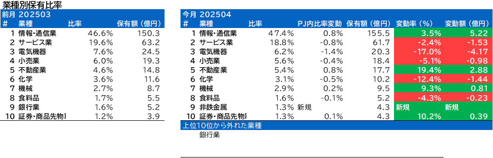 不動産業の保有比率はPF内5位で変わりませんでしたが業種指数の変動以上に大きく上昇しました。