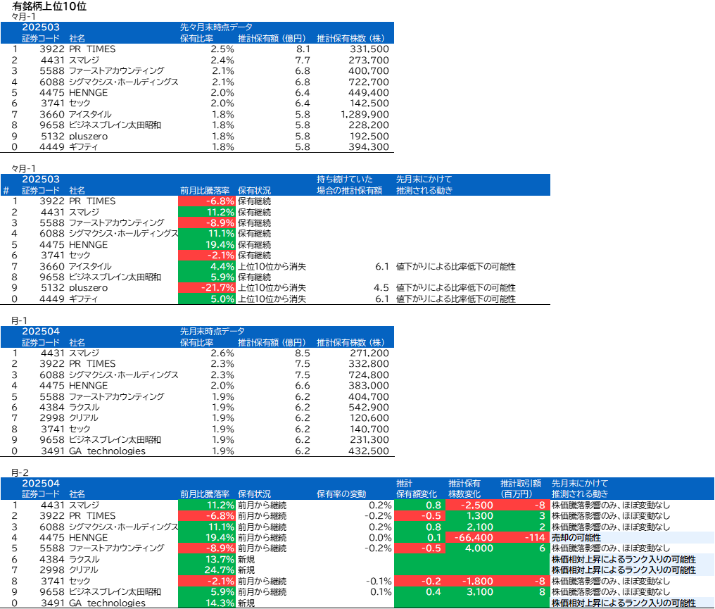 アイスタイル、pluszero、ギフティ、ラクスル、クリアル、GA technologiesについて、組入上位銘柄の変動がありました。