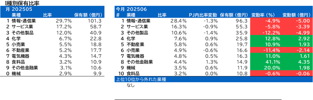 その他金融業の保有比率がPF内9位からPF内8位に上がり、業種指数の変動以上に大きく上昇しました。