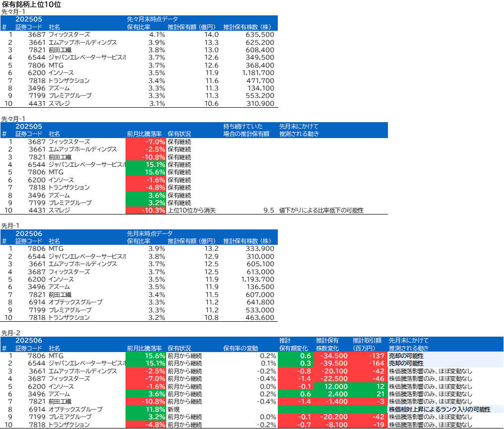 先月の保有内4位のジャパンエレベーターサービスホールディングスは今月は2位でした。騰落率と保有額からの推計によると売却があったと思われます。