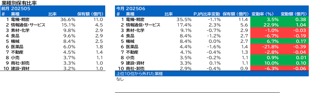 情報通信・サービスの保有比率はPF内2位で変わりませんでしたが業種指数の変動以上に大きく上昇しました。