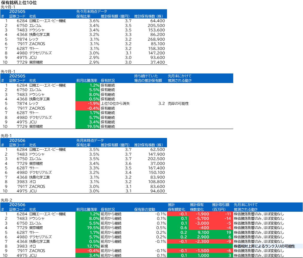 先月の保有5位のレックは、今月の保有上位10銘柄には入っていませんでした。評価額減ではなく、売却があったと思われます。
