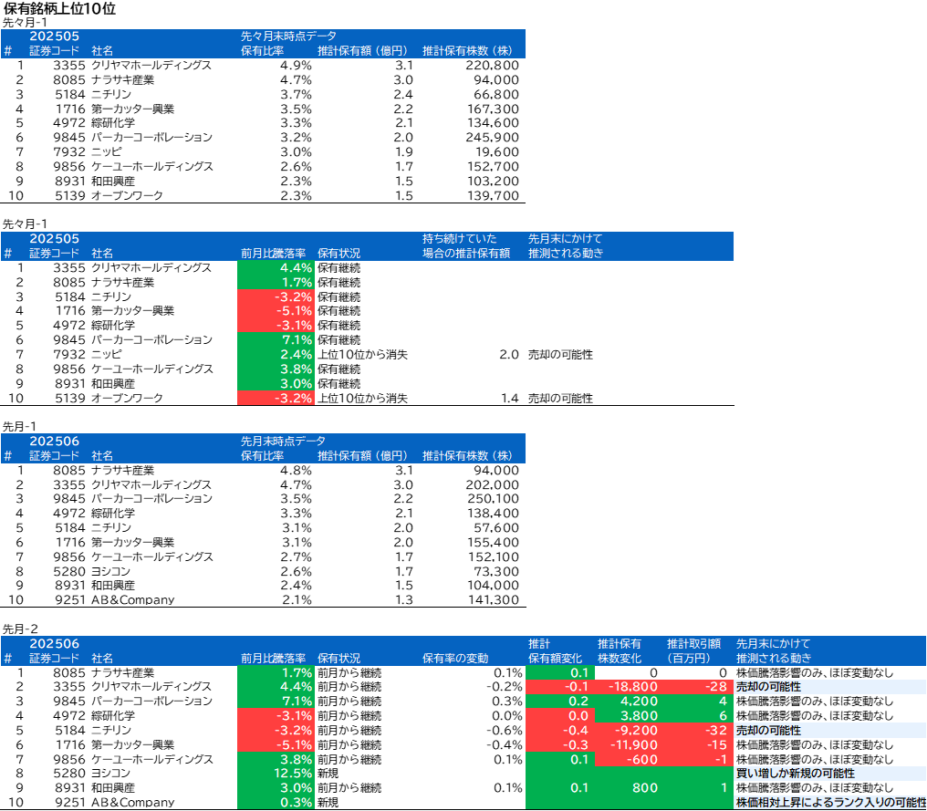 ニッピ、オープンワーク、ヨシコン、AB&Companyについて、組入上位銘柄の変動がありました。