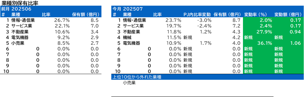 不動産業の保有比率はPF内3位で変わりませんでしたが業種指数の変動以上に大きく上昇しました。