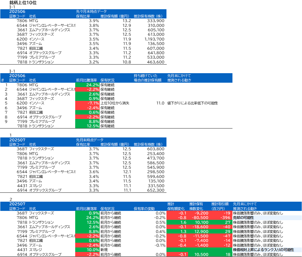 先月の保有内1位のMTGは今月は2位でした。騰落率と保有額からの推計によると売却があったと思われます。
