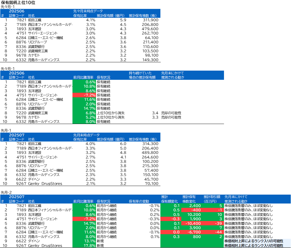 武蔵精密工業、カナモト、ダイヘン、Genky DrugStoresについて、組入上位銘柄の変動がありました。