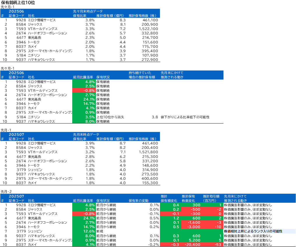 先月の保有9位のニチリンは、今月の保有上位10銘柄には入っていませんでした。値下がりにより相対的に株価が下落した結果だと思われます。