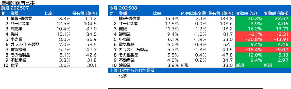 業種別保有比率に変動がありました。