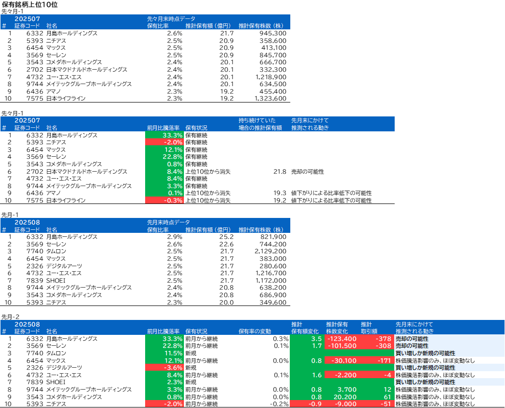 先月の保有内1位の月島ホールディングスは今月も1位でしたが、騰落率と保有額からの推計によると売却があったと思われます。
