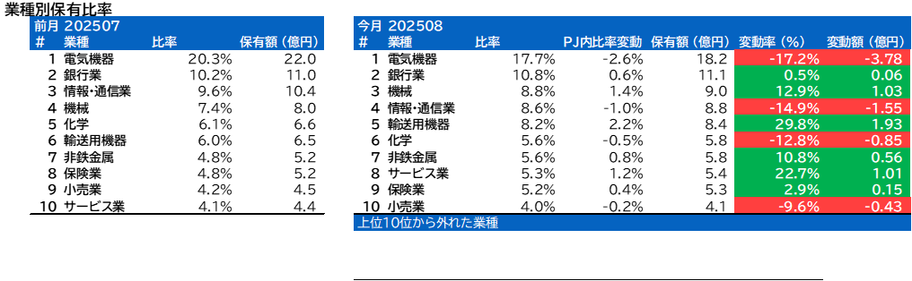業種別保有比率に変動がありました。