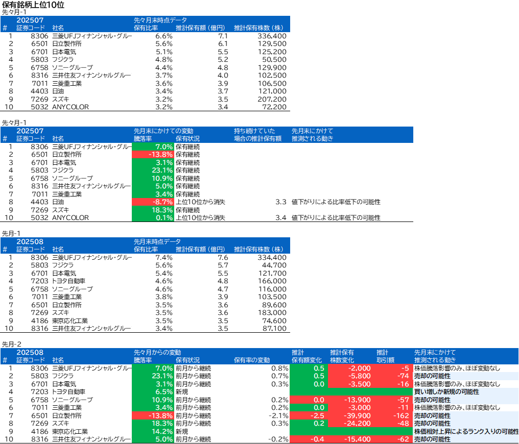 先月の保有内5位のソニーグループは今月も5位でしたが、騰落率と保有額からの推計によると売却があったと思われます。