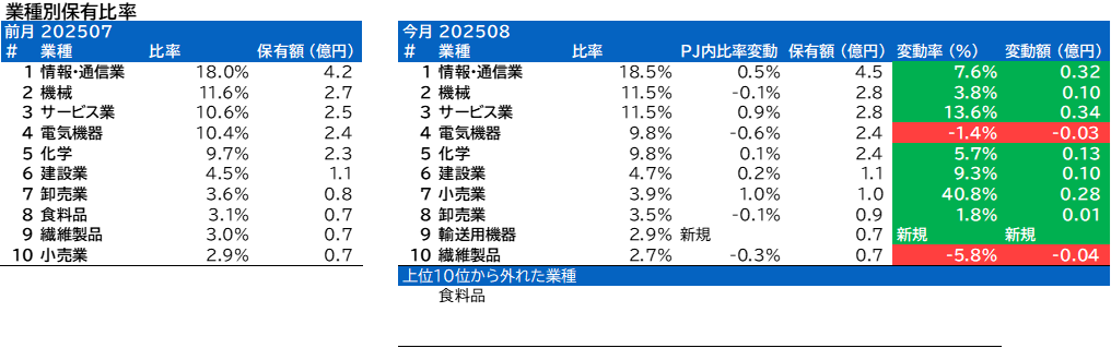 小売業の保有比率がPF内10位からPF内7位に上がり、業種指数の変動以上に大きく上昇しました。