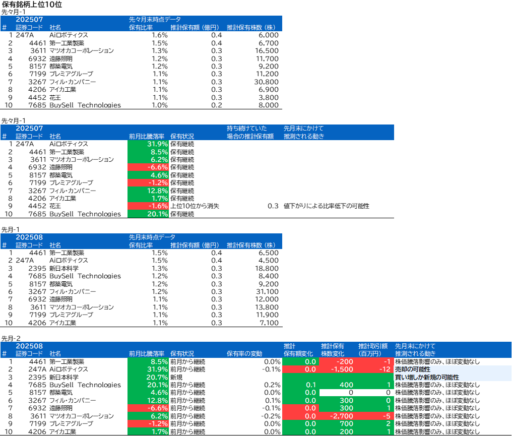 先月の保有内1位のAiロボティクスは今月は2位でした。騰落率と保有額からの推計によると売却があったと思われます。