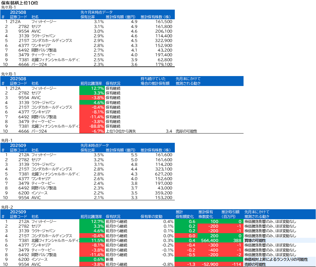 パーク24、インソースについて、組入上位銘柄の変動がありました。