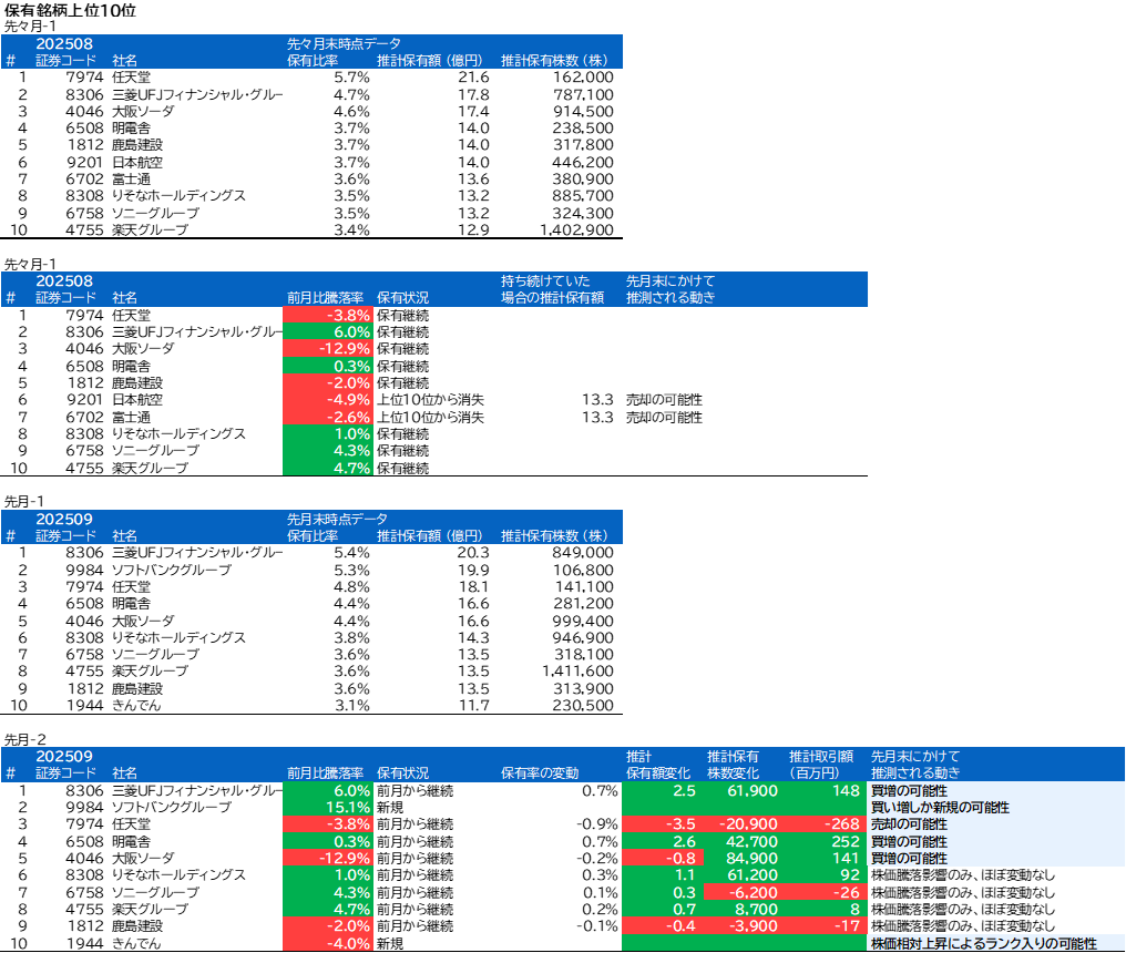 先月の保有内2位の三菱UFJフィナンシャル・グループは今月は1位でした。騰落率と保有額からの推計によると買い増しされたと思われます。