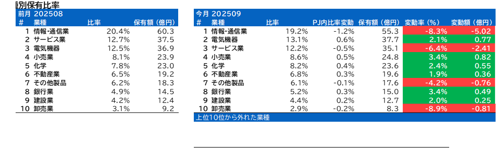 情報·通信業の保有比率はPF内1位で変わりませんでしたが業種指数の変動以上に大きく下落しました。