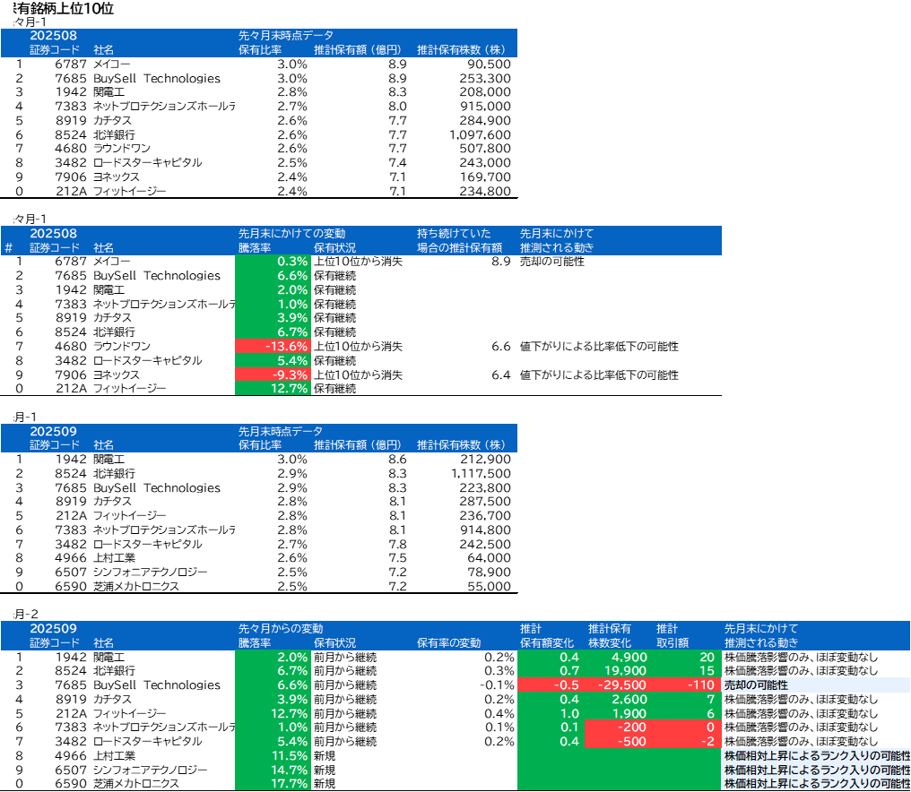 先月の保有1位のメイコーは、今月の保有上位10銘柄には入っていませんでした。評価額減ではなく、売却があったと思われます。