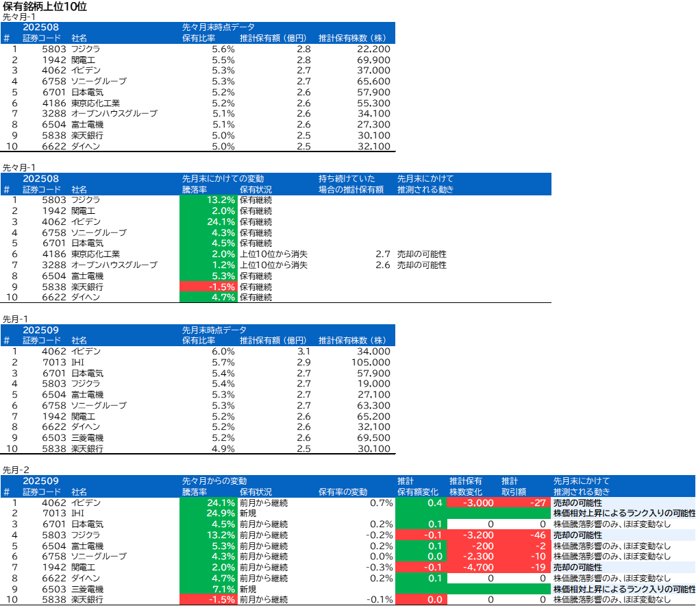 先月の保有内2位の関電工は今月は7位でした。騰落率と保有額からの推計によると売却があったと思われます。