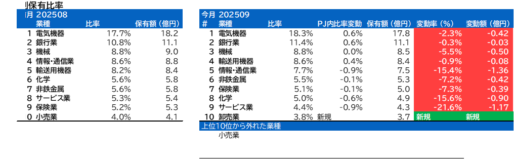 輸送用機器、非鉄金属、保険業の保有比率がPF内で上がりました。