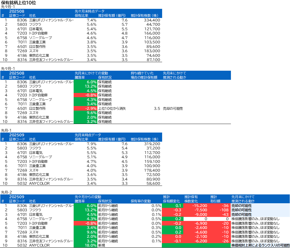 先月の保有内1位の三菱UFJフィナンシャル・グループは今月も1位でしたが、騰落率と保有額からの推計によると売却があったと思われます。