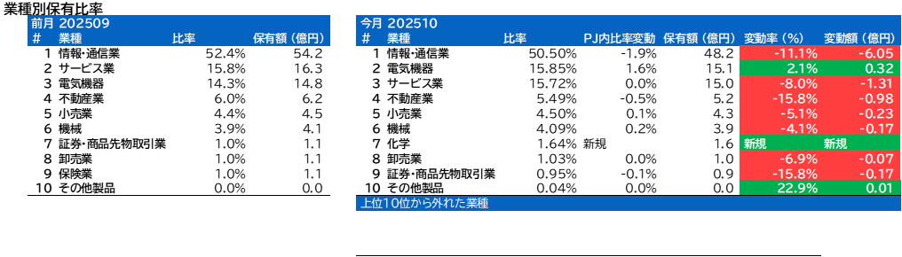 情報·通信業の保有比率はPF内1位で変わりませんでしたが業種指数の変動以上に大きく下落しました。