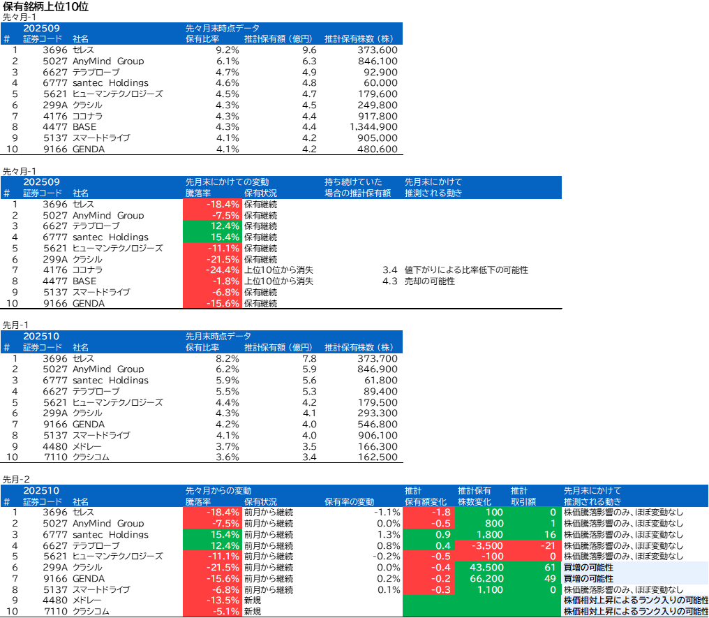 ココナラ、BASE、メドレー、クラシコムについて、組入上位銘柄の変動がありました。